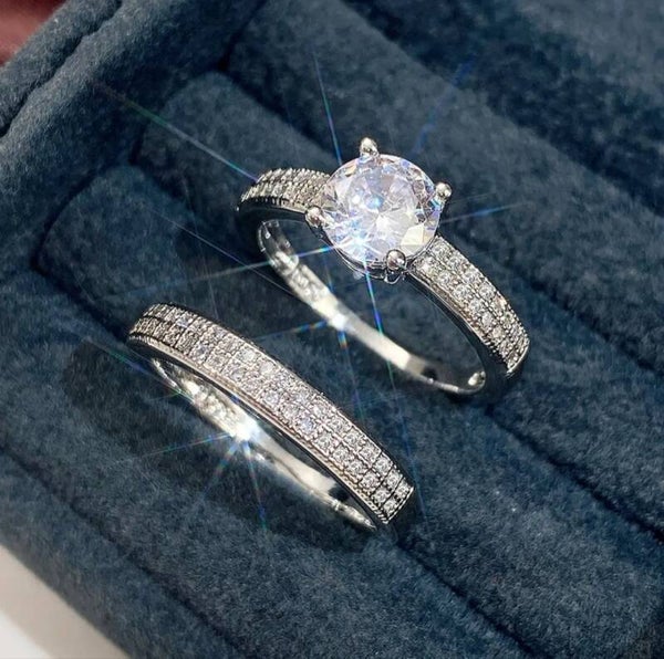 Sublime ensemble de bague serti de brillants étincelants, avec une pierre centrale majestueuse. Parfait pour un mariage ou des fiançailles inoubliables.